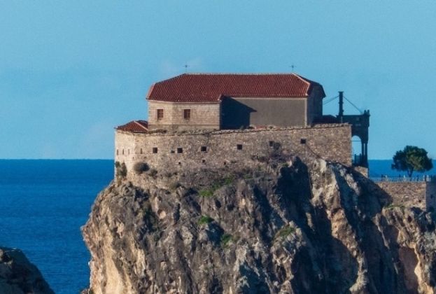 Vanaf het balkon aan de achterkant van het huis heb je een prachtig uitzicht op de grote rots. Aan die rots dankt Petra haar naam: petra betekent rots in het Grieks. Op de rots staat een historische kerk.
