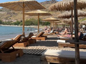 Petra grenst aan de zee. Over de hele lengte van het stadje vind je gezellige restaurants en barretjes met zeezicht. Ligstoelen zijn hier gratis, mits je een drankje bestelt. Ook het zandstrand van Anaxos, de badplaats grenzend aan Petra, is geliefd.